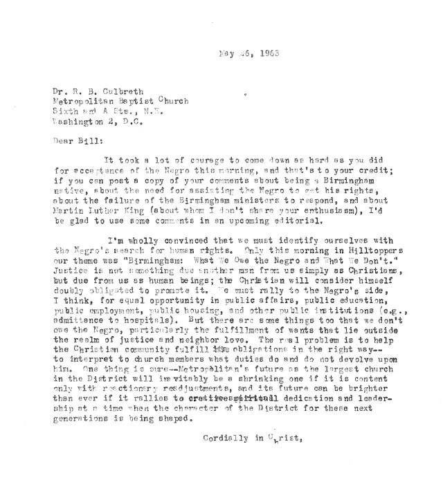 Parmi eux se trouvait R. B. Culbreth. Pasteur de la Metropolitan Baptist Church (aujourd’hui Capitol Hill Baptist Church) à Washington, DC, Culbreth dirigeait une communauté qui, comme de nombreuses églises baptistes du Sud, n’avait pas encore intégré de membres noirs. Pendant des années, l’église incarna cette forme de modération que King dénonçait : soutenir les droits civiques en théorie, tout en hésitant à prendre position fermement. Mais au moment où King rédigeait sa lettre, Culbreth commençait à changer de point de vue — une évolution soulignée par une lettre récemment redécouverte, écrite par Carl F. H. Henry, alors membre de l’église Metropolitan et qui fut aussi le premier rédacteur en chef du magazine Christianity Today.