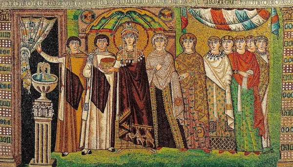 Théodora, l’impératrice du 4e siècle qui orne les murs de San Vitale, était si puissante et influente que les spécialistes la considèrent souvent comme la co-dirigeante (voire la véritable dirigeante) de Byzance. Théodora avait probablement été actrice et prostituée (ces rôles étaient souvent liés) avant d’épouser Justinien.